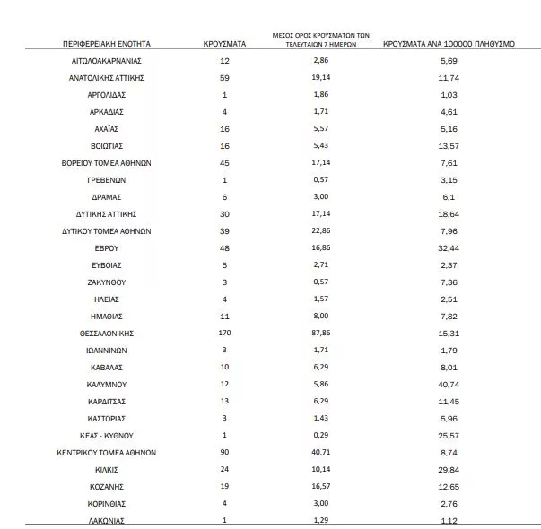 Aπό τα 942 νέα κρούσμστα τα 341, εντοπίστηκαν στην περιφέρεια Αττικής και τα 170 στην περιφέρεια Θεσσαλονίκης.Σύμφωνα με τον πίνακα που δημοσιεύει ο ΕΟΔΥ, στον κεντρικό Τομέα Αθηνών, εντοπίστηκαν την τελευταία ημέρα 90 νέα κρούσματα. Σε ό, τι αφορά τη Δυτική Αττική, η οποία παραμένει σε αυστηρό Lockdown, εκεί καταγράφονται 30 νέες περιπτώσεις του κορωνοϊού.