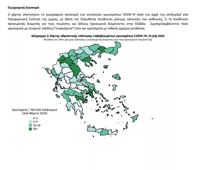 Σημειώνεται πως 1370 (26.7%) θεωρούνται σχετιζόμενα με ταξίδι από το εξωτερικό και 2551 (49.8%) είναι σχετιζόμενα με ήδη γνωστό κρούσμα.