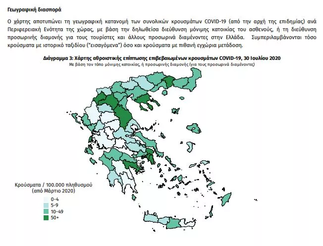 Από το σύνολο των 4401 κρουσμάτων, 1250 (28.4%) θεωρούνται σχετιζόμενα με ταξίδι από το εξωτερικό, 2192 (49.8%) είναι σχετιζόμενα με ήδη γνωστό κρούσμα και τα υπόλοιπα δεν σχετίζονται ούτε με ταξίδι ούτε με άλλο γνωστό κρούσμα ή είναι ακόμα υπό διερεύνηση
