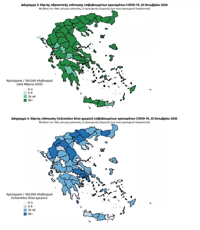 Σήμερα, 25/10/2020, δηλώθηκαν επιπλέον 790 κρούσματα. Από τα 757 εγχώρια κρούσματα, τα 76 συνδέονται με γνωστές συρροές.