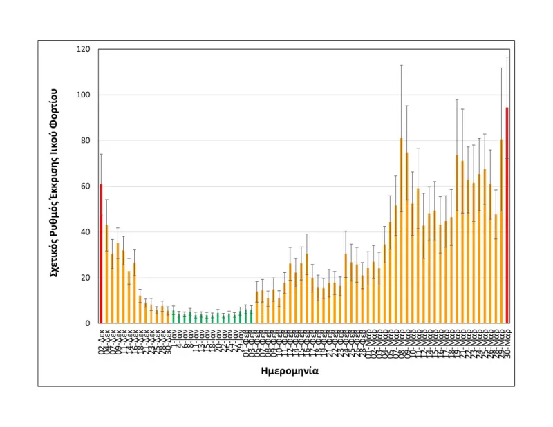- Αυξημένη κατά 61% σε σχέση με τη μέση τιμή των δύο αμέσως προηγούμενων μετρήσεων, της Παρασκευής 26/3 και της Κυριακής 28/3.
