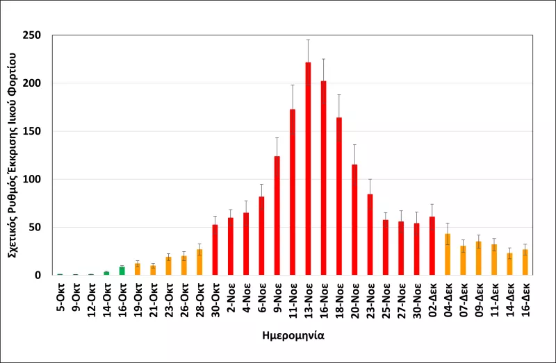 Στο διάγραμμα που παρουσιάζει το ΑΠΕ-ΜΠΕ φαίνεται ότι τις τελευταίες δύο εβδομάδες και από τη στιγμή που το ιικό φορτίο πέρασε στο πορτοκαλί από το κόκκινο επίπεδο, υπάρχουν μικρές αυξομειώσεις, που δείχνουν ωστόσο ότι έχει ανακοπεί η τάση αποκλιμάκωσης, η οποία είχε καταγραφεί από τα μέσα έως τα τέλη Νοεμβρίου.