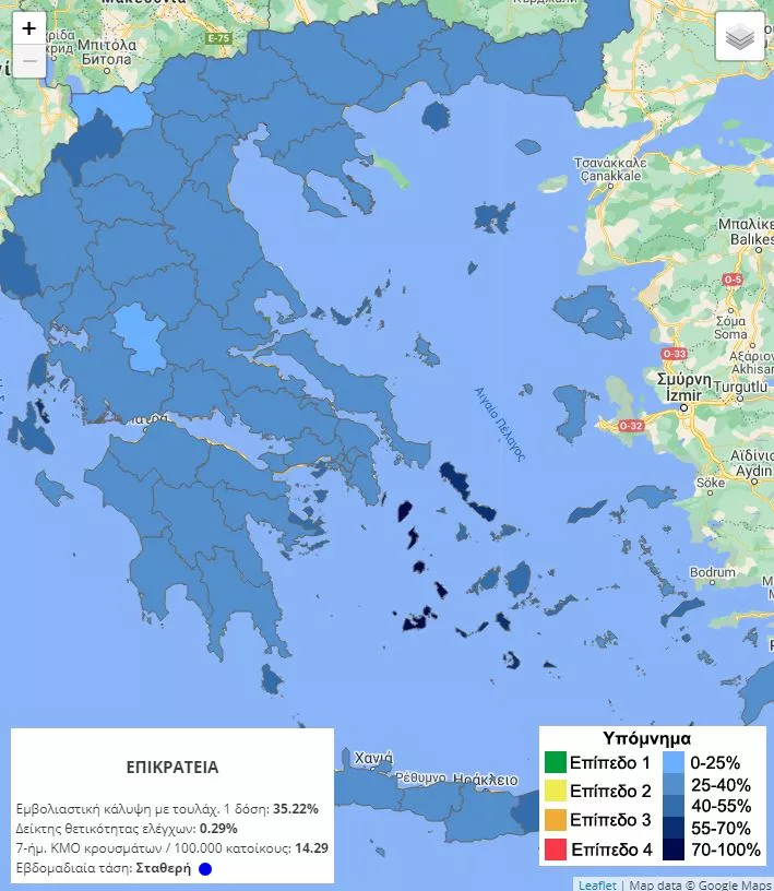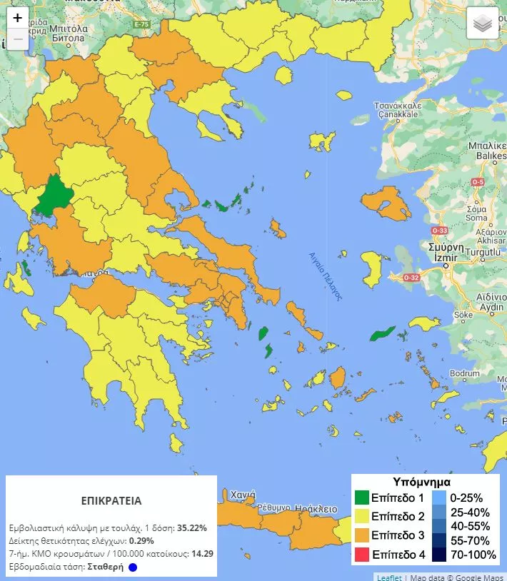 Ο επιδημιολογικός χάρτης θα παράγεται εβδομαδιαίως σε επίπεδο Περιφερειακής ενότητας και ειδικά για τα νησιά σε επίπεδο Δήμου.