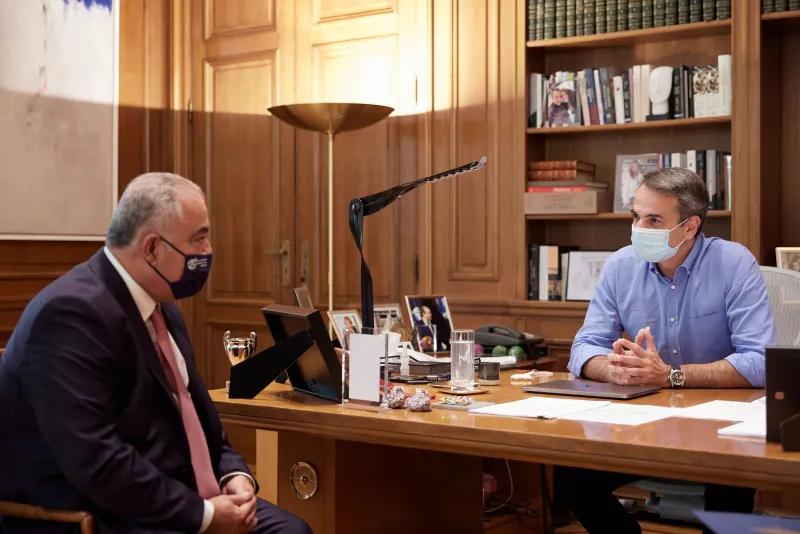 Στη συνάντηση συμμετείχαν ο γενικός γραμματέας του πρωθυπουργού Γρηγόρης Δημητριάδης και ο προεδρεύων του ΕΒΕΑ Γιάννης Μπρατάκος.