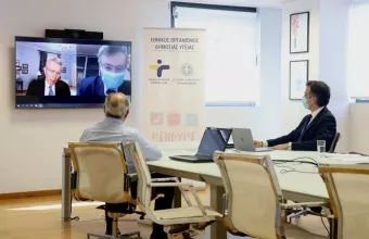 Τηλεδιάσκεψη μεταξύ του Αμερικανού Πρέσβη Τζέφρι Πάιατ, του προέδρου του Εθνικού Οργανισμού Δημόσιας Υγείας (ΕΟΔΥ) Παναγιώτη Αρκουμανέα, του αντιπροέδρου Γιώργου Παναγιωτακόπουλου και του Καθηγητή Σωτήρη Τσιόδρα πραγματοποιήθηκε σήμερα Τρίτη στον ΕΟΔΥ, με