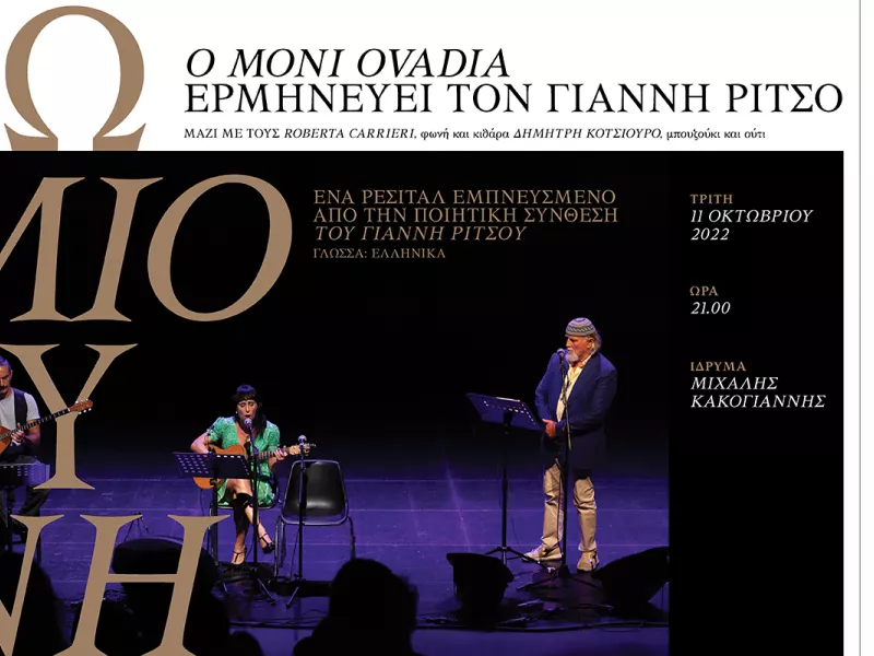 Η παράσταση, που πραγματοποιείται σε συνεργασία του Ιδρύματος με το Ιταλικό Μορφωτικό Ινστιτούτο Αθηνών, την Ιταλική Σχολή Αθηνών και τον Σ.Ε.Π.Ι. (Σύνδεσμος Επιστημόνων Πανεπιστημίων Ιταλίας), είναι ένα ρεσιτάλ τραγουδιών, μουσικής και λόγου που εκτυλίσσεται κατά μήκος των στίχων του Γιάννη Ρίτσου. Ο Οβάντια, ευαίσθητος και πρωτότυπος μουσικός, που εμπνέεται πάντοτε κι εκφράζει με τη μουσική και τα ρετσιτατίβα του την οικουμενικότητα της κουλτούρας, που καίτοι αναπτύσσεται πάντα σε μία στοιβάδα τοπική κι ιστορική, ξεπερνά κάθε στενό όριο κι αποτελεί μία κοινή κοιτίδα, απ' όπου αντλούνται επιρροές που εμπλουτίζουν δυναμικά τους λαούς που έρχονται σε επαφή.