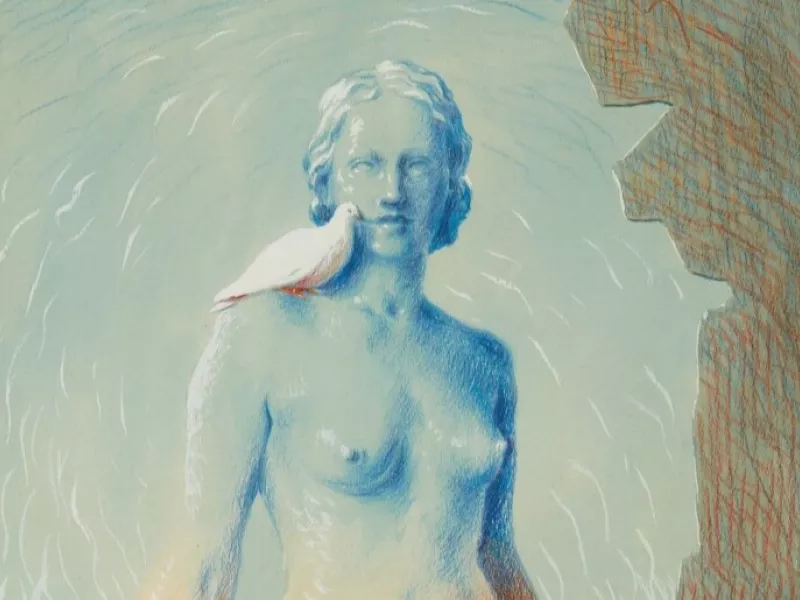 Η Ζορζέτ ποζάρει θυμίζοντας μαρμάρινο άγαλμα, ακουμπώντας το ένα της χέρι σε έναν βράχο ενώ ένα περιστέρι βρίσκεται στον δεξί της ώμο.