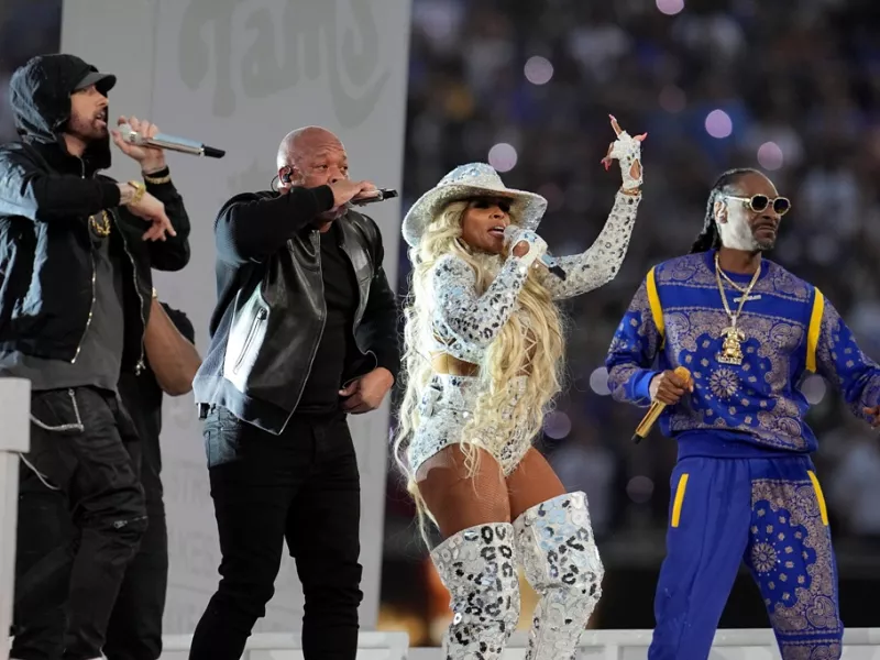 Τον αγώνα παρακολούθησαν πάνω από 70.000 θεατές στο υπερσύγχρονο SoFi Stadium στη νότια Καλιφόρνια. Το φαντασμαγορικό σόου απογειώθηκε με τις μοναδικές ερμηνείες των Dr. Dre, Eminem, Mary J. Blige, Snoop Dogg, Kendrick Lamar και 50 Cent.