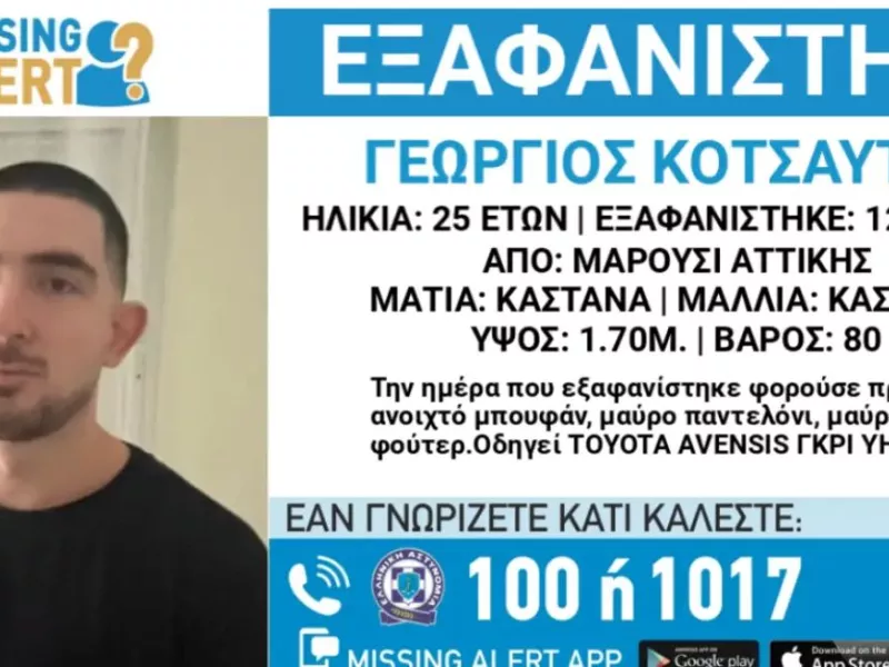 Νεκρός βρέθηκε ο 25χρονος Γιώργος Κοτσαύτης, τα ίχνη του οποίου είχαν χαθεί από το Μαρούσι από τις 12 Ιανουαρίου. Η σορός του εντοπίστηκε το βράδυ της Πέμπτης σε οικοδομή στην Αγία Παρασκευή, βάζοντας τέλος στην αγωνία που βίωνε η οικογένειά του επί ημέρες.
