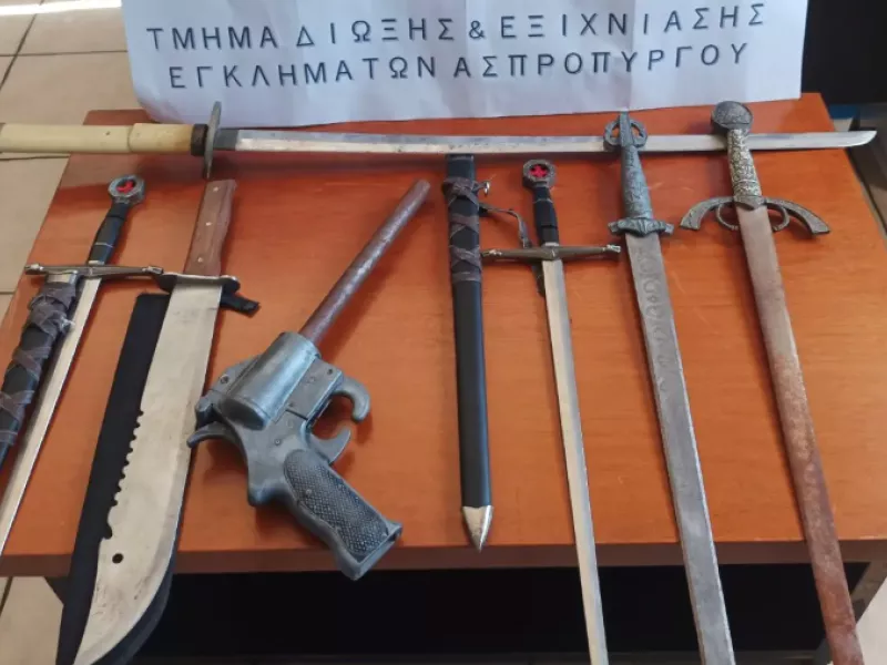 Στο πλαίσιο διερεύνησης πληροφοριών σχετικά με οικία όπου αποκρύπτονταν πυροβόλο όπλο, σπαθί και ξιφίδια, πραγματοποιήθηκε έρευνα στο πλαίσιο της οποίας βρέθηκαν και κατασχέθηκαν, σύμφωνα με την ΕΛΑΣ: Σπαθί τύπου «κατάνα», 4 ξιφίδια, μαχαίρι επιβίωσης και αυτοσχέδιο πιστόλι.
