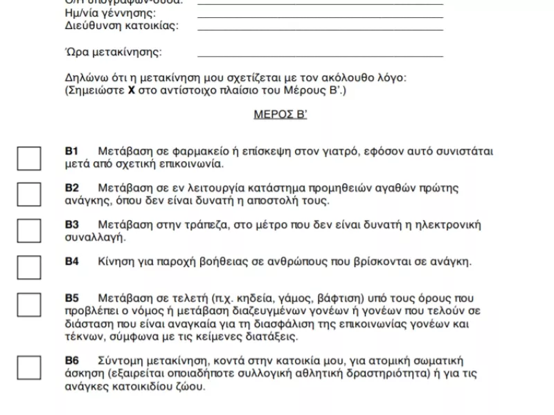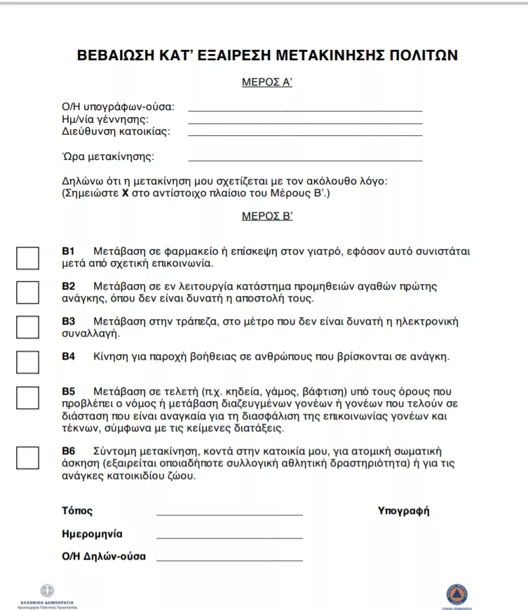 - Για τις άλλες περιπτώσεις (μετάβαση σε σούπερ μάρκετ, φαρμακείο, τράπεζα κοκ) και για κάθε μεμονωμένη κίνηση οι πολίτες πρέπει να συμπληρώνουν κάθε φορά τη βεβαίωση τύπου Β με το ονοματεπώνυμο, τον τόπο κατοικίας και τον τόπο προορισμού του πολίτη, καθώς και τον συγκεκριμένο λόγο της μετακίνησης.