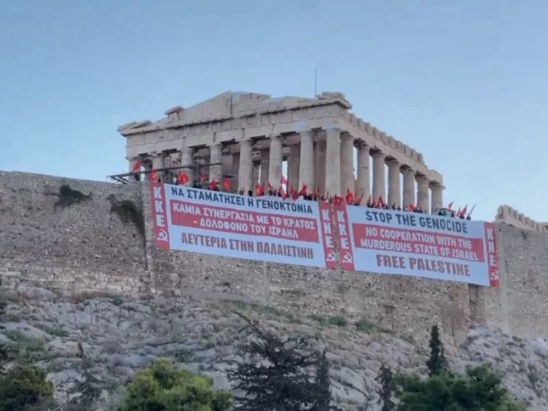 Δύο γιγαντοπανό με μήνυμα αλληλεγγύης στον παλαιστινιακό λαό ανήρτησαν μέλη του ΚΚΕ και της ΚΝΕ, νωρίς το πρωί της Παρασκευής, στον βράχο της Ακρόπολης.