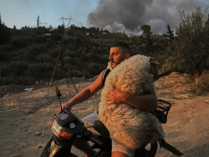 Τον περασμένο Αύγουστο η Πάτρα δοκιμάστηκε από μία μεγάλη φωτιά. Τότε ήταν που ο φωτογράφος, Θανάσης Σταυράκης, συνεργαζόμενος του πρακτορείου Reuters, «αιχμαλώτισε» με την κάμερά του μία συγκλονιστική στιγμή, όταν ένας άνδρας αλβανικής καταγωγής, έσωσε από τις εκτάσεις που φλέγονταν ένα πρόβατο, κουβαλώντας το πάνω στο μηχανάκι του.