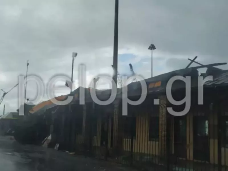 Εικόνες καταστροφής καταγράφονται στο λιμάνι, εκεί όπου ξηλώθηκαν στέγες παλαιών κτιρίων, όπως φαίνεται και από τις φωτογραφίες του pelopgr. Ήδη εκεί βρίσκονται δυνάμεις τόσο της Πυροσβεστικής όσο και της Αστυνομίας.
