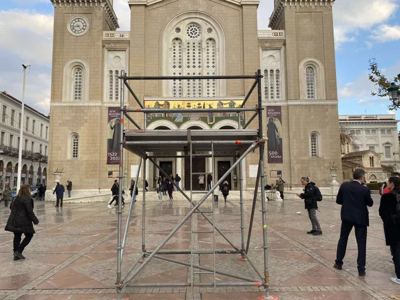 Υπεύθυνοι ασφαλείας βρίσκονται στον ιερό μητροπολιτικό ναό για να ρυθμίσουν τις τελευταίες λεπτομέρειες.