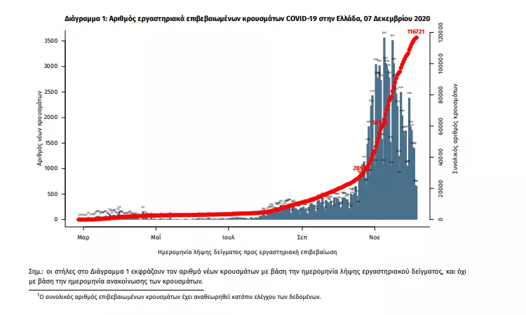 Τα στοιχεία που παρουσιάζονται αφορούν περιστατικά από την επιδημιολογική επιτήρηση της νόσου από το νέο κορωνοϊό (COVID19), με βάση τα δεδομένα που έχουν δηλωθεί στον ΕΟΔΥ και καταγραφεί μέχρι τις 07 Δεκεμβρίου 2020 (ώρα 15:00). Τα νέα εργαστηριακά επιβεβαιωμένα κρούσματα της νόσου είναι 1251, εκ των οποίων 20 εντοπίστηκαν κατόπιν ελέγχων στις πύλες εισόδου της χώρας. Ο συνολικός αριθμός των κρουσμάτων ανέρχεται σε 116721 (ημερήσια μεταβολή +1.1%), εκ των οποίων 52.7% άνδρες. 1 Οι νέοι θάνατοι ασθενών με COVID-19 είναι 89, ενώ από την έναρξη της επιδημίας έχουν καταγραφεί συνολικά 3092 θάνατοι.Η διάμεση ηλικία των ασθενών που απεβίωσαν είναι 79 έτη. Ο αριθμός των ασθενών που νοσηλεύονται διασωληνωμένοι είναι 600 (72.2% άνδρες). Η ημερήσια κατανομή των επιβεβαιωμένων κρουσμάτων είναι η ακόλουθη (η γραμμή παριστάνει την συνολική, αθροιστική κατανομή των κρουσμάτων).