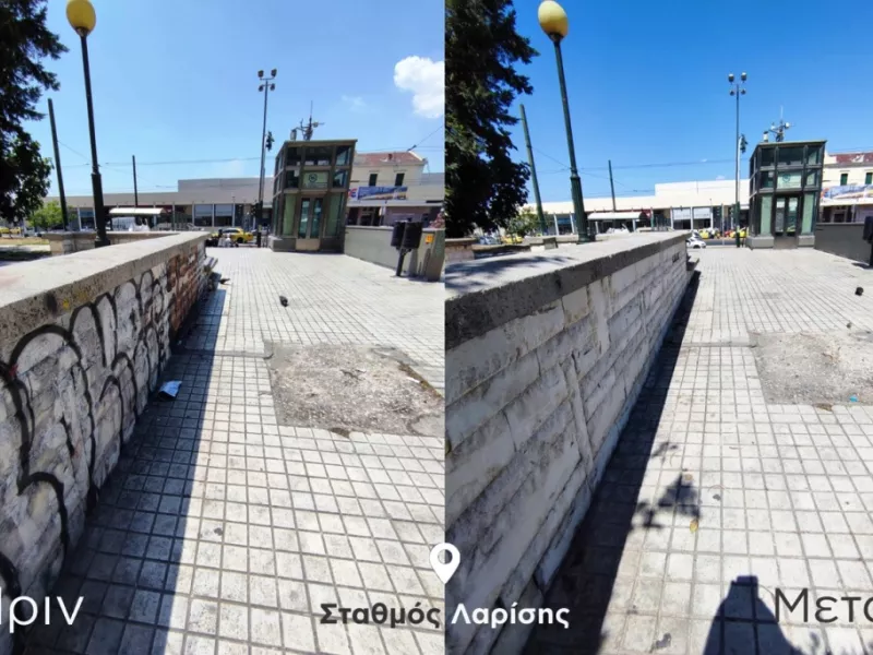 Συγκεκριμένα, στην πολυσύχναστη πλατεία Λαρίσης, καθαρίστηκαν συνολικά 460 τ.μ. επιφάνειας από πέτρα και μάρμαρο. Η διαδικασία της αφαίρεσης, με υψηλή πίεση νερού και ειδικό διαλυτικό υγρό (συνολικά 145 λίτρα) χρειάστηκε να επαναληφθεί αρκετές φορές, καθώς οι μπογιές και τα σπρέι από τα γκράφιτι κάλυπταν για μεγάλο χρονικό διάστημα τη συγκεκριμένη επιφάνεια, δυσκολεύοντας το έργο της αποκατάστασης. Παρολ' αυτά, η επιχείρηση, που διήρκησε περίπου μία εβδομάδα με τη συμμετοχή εννέα εργαζομένων του δήμου, ολοκληρώθηκε με επιτυχία και η πλατεία έχει αποκτήσει ξανά, μετά από πολλά χρόνια, την καθαρή όψη που αρμόζει σε έναν δημόσιο χώρο.