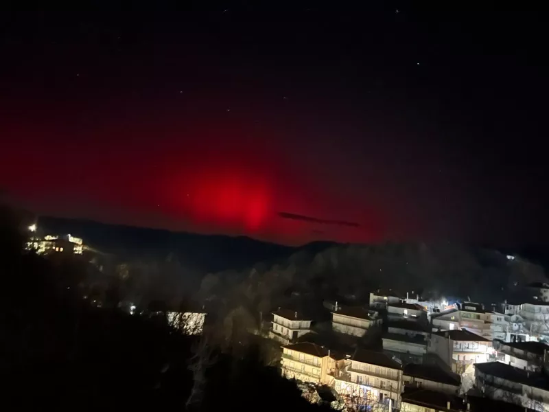 Στις φωτογραφίες που έστειλε ο Γιουξέλ Πετσενίκ, ο νυχτερινός ουρανός βάφεται με βαθιές κόκκινες και πορφυρές αποχρώσεις, δημιουργώντας μια εντυπωσιακή αντίθεση με τα φώτα των σπιτιών και το σκοτεινό ανάγλυφο της περιοχής. Το φως απλώνεται σαν πέπλο πάνω από το χωριό, δίνοντας την αίσθηση ότι ο ουρανός κατεβαίνει χαμηλά, αγγίζοντας σχεδόν τις στέγες.