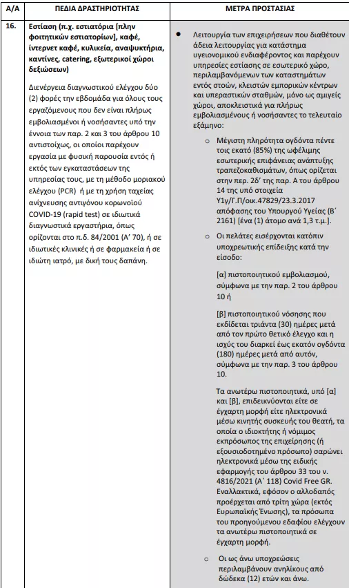 Το μέτρο αφορά εστιατόρια, καφέ, ίντερνετ καφέ, κυλικεία και αναψυκτήρια μεταξύ άλλων, όπου ενήλικοι ανήλικοι από 12 ετών και άνω πρέπει να επιδεικνύουν πιστοποιητικό εμβολιασμού ή πιστοποιητικό νόσησης, που εκδίδεται 30 ημέρες μετά τον πρώτο θετικό έλεγχο και η ισχύς του διαρκεί έως 180 ημέρες.