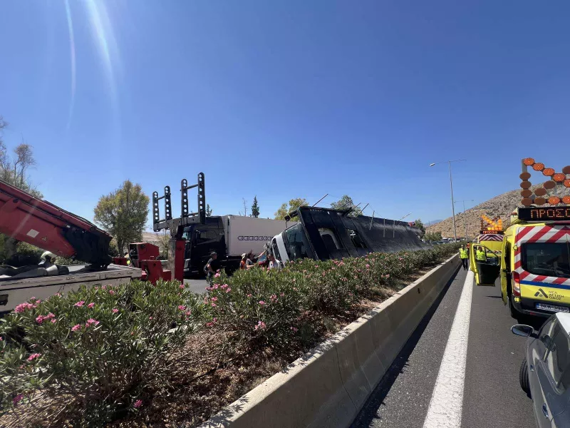 Νταλίκα που μετέφερε ΙΧ αυτοκίνητα ντεραπάρισε μετά από σύγκρουση με φορτωμένο αγροτικό φορτηγάκι στην Αττική οδό, με αποτέλεσμα να φύγουν στο αντίθετο ρεύμα της Αττικής οδού δύο από τα οχήματα, που μετέφερε η νταλίκα, νωρίς το μεσημέρι της Δευτέρας.
