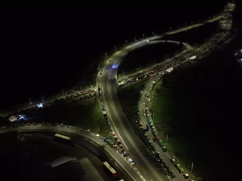 Στο οδόστρωμα παραμένουν τα τρακτέρ, με τις κινητοποιήσεις των αγροτών να εισέρχονται στην πιο κρίσιμη φάση τους. Οι νυχτερινές, εναέριες εικόνες του Orange Press από το μπλόκο της Νίκαιας είναι χαρακτηριστικές: Μια ατέλειωτη σειρά από φώτα και σιδερένιους όγκους μέσα στο σκοτάδι, σκηνές με αναμμένα φώτα και βαρέλια με φωτιά για το τσουχτερό κρύο.