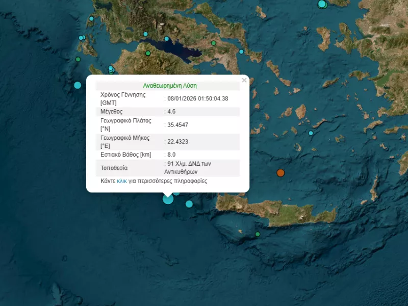 Σεισμική δόνηση 4,6 βαθμών, που χαρακτηρίζεται «ασθενής», καταγράφτηκε στις 03:50 στον θαλάσσιο χώρο ανατολικά της Κρήτης, 91 χιλιόμετρα δυτικά-νοτιοδυτικά των Αντικυθήρων, ή αλλιώς 303 χιλιόμετρα νότια-νοτιοδυτικά της πρωτεύουσας, σε βάθος κάπου 8 χιλιομέτρων, ανακοίνωσε τις πρώτες πρωινές ώρες το Γεωδυναμικό Ινστιτούτο του Εθνικού Αστεροσκοπείου της Αθήνας.