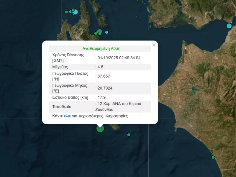 Σεισμική δόνηση μεγέθους 4,5 βαθμών της κλίμακας Ρίχτερ σημειώθηκε στις 05:49 τα ξημερώματα της Τετάρτης, ανοικτά των νοτιοδυτικών ακτών της Ζακύνθου.
