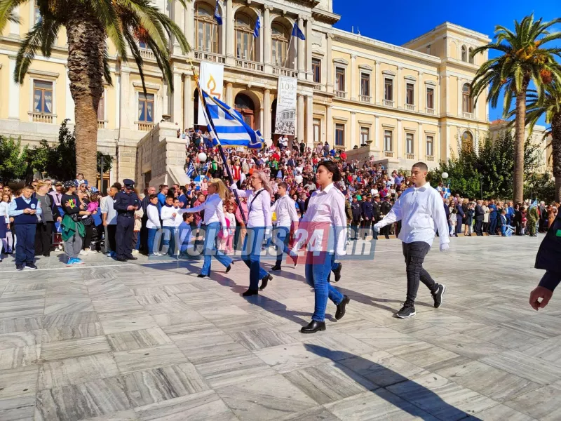 Με τη μητέρα σημαιοφόρο και το γιο παραστάτη, οι δυο τους τράβηξαν τα βλέμματα και εισέπραξαν δυνατά χειροκροτήματα στην παρέλαση στη Σύρο για την 28η Οκτωβρίου.
