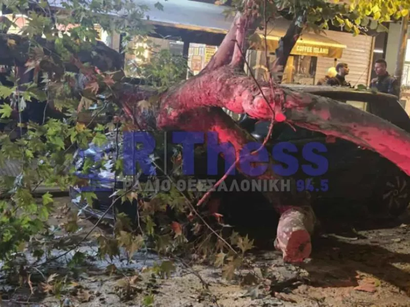 Δέντρο ξεριζώθηκε σε κεντρικό δρόμο της Θεσσαλονίκης, καταπλακώνοντας σταθμευμένο αυτοκίνητο, το οποίο υπέστη υλικές ζημιές.
