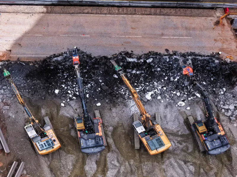 Λίγο πριν τις 8 το πρωί ξεκίνησαν οι εργασίες και μπουλντόζες και ειδικά μηχανήματα άρχισαν να γκρεμίσουν τμήμα της γέφυρας.