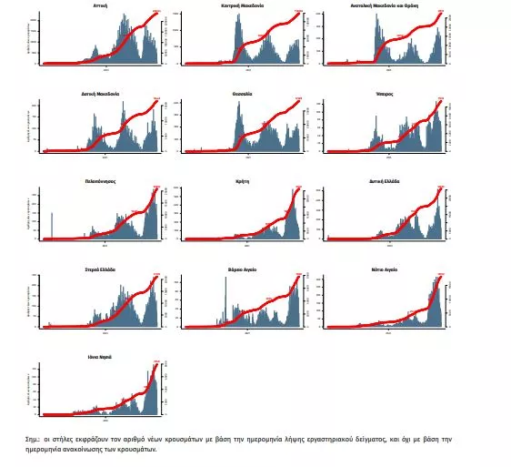 Παράρτημα 1: Επιδημικές καμπύλες κρουσμάτων COVID-19 με βάση την δηλωθείσα διεύθυνση μόνιμης κατοικίας του κρούσματος ή τη διεύθυνση προσωρινής διαμονής για τους τουρίστες και άλλους προσωρινά διαμένοντες στην Ελλάδα. Συμπεριλαμβάνονται τόσο κρούσματα με ιστορικό ταξιδίου όσο και κρούσματα με πιθανή εγχώρια μετάδοση