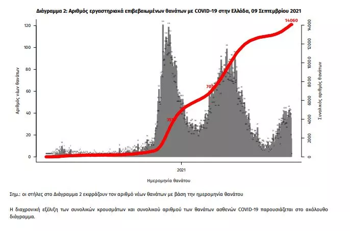Οι νέοι θάνατοι ασθενών με COVID-19 είναι 43, ενώ από την έναρξη της επιδημίας έχουν καταγραφεί συνολικά 14.060 θάνατοι. 2 Το 95.4% είχε υποκείμενο νόσημα ή/και ηλικία 70 ετών και άνω.