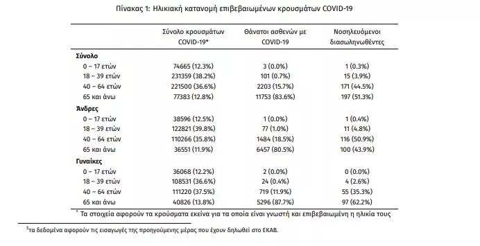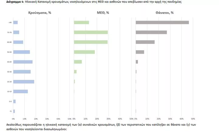 Ο αριθμός των ασθενών που νοσηλεύονται διασωληνωμένοι είναι 384 (59.1% άνδρες). Η διάμεση ηλικία τους είναι 65 έτη. To 82.3% έχει υποκείμενο νόσημα ή/και ηλικία 70 ετών και άνω. Μεταξύ των ασθενών που νοσηλεύονται διασωληνωμένοι, 343 (89.32%) είναι ανεμβολίαστοι ή μερικώς εμβολιασμένοι και 41 (10.68%) είναι πλήρως εμβολιασμένοι. Από την αρχή της πανδημίας έχουν εξέλθει από τις ΜΕΘ 3.027 ασθενείς. Οι εισαγωγές3 νέων ασθενών Covid-19 στα νοσοκομεία της επικράτειας είναι 212 (ημερήσια μεταβολή +4.95%). Ο μέσος όρος εισαγωγών του επταημέρου είναι 221 ασθενείς.Η διάμεση ηλικία των κρουσμάτων είναι 39 έτη (εύρος 0.2 έως 106 έτη), ενώ η διάμεση ηλικία των θανόντων είναι 78 έτη (εύρος 0.2 έως 106 έτη).