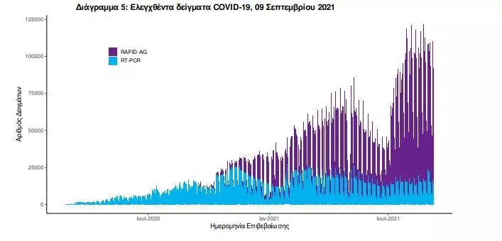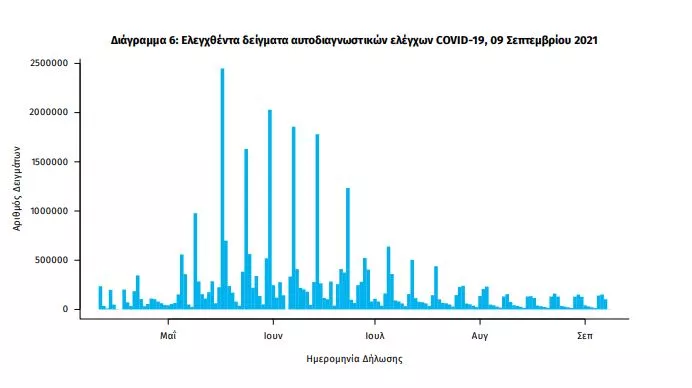 Αυτοδιαγνωστικοί έλεγχοι (Self-tests): Έως 08 Σεπτεμβρίου 2021, έχουν καταγραφεί ηλεκτρονικά 33.473.894 δηλώσεις αποτελέσματος αυτοδιαγνωστικού ελέγχου, ενώ 1.178.221 άτομα προσήλθαν για επανέλεγχο.