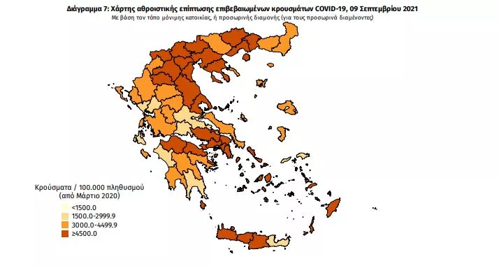 Γεωγραφική διασπορά: Ο χάρτης αποτυπώνει τη γεωγραφική κατανομή των συνολικών κρουσμάτων COVID-19 (από την αρχή της επιδημίας) ανά Περιφερειακή Ενότητα της χώρας, με βάση την δηλωθείσα διεύθυνση μόνιμης κατοικίας του ασθενούς, ή τη διεύθυνση προσωρινής διαμονής για τους τουρίστες και άλλους προσωρινά διαμένοντες στην Ελλάδα. Συμπεριλαμβάνονται τόσο κρούσματα με ιστορικό ταξιδίου (“εισαγόμενα”) όσο και κρούσματα με πιθανή εγχώρια μετάδοση.