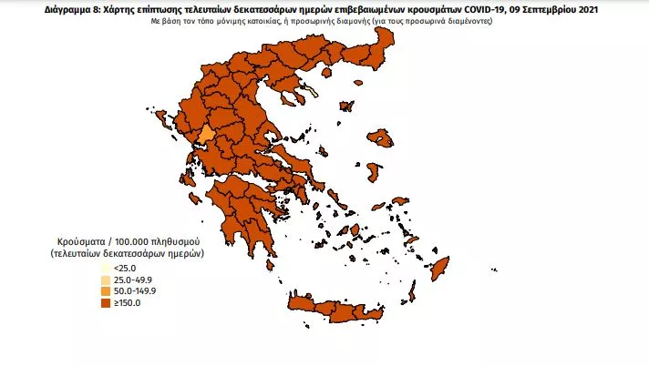 Τα νέα εργαστηριακά επιβεβαιωμένα κρούσματα της νόσου που καταγράφηκαν τις τελευταίες 24 ώρες είναι 2.170, εκ των οποίων 6 εντοπίστηκαν κατόπιν ελέγχων στις πύλες εισόδου της χώρας. Ο συνολικός αριθμός των κρουσμάτων ανέρχεται σε 609.519 (ημερήσια μεταβολή +0.4%), εκ των οποίων 51.0% άνδρες. Με βάση τα επιβεβαιωμένα κρούσματα των τελευταίων 7 ημερών, 170 θεωρούνται σχετιζόμενα με ταξίδι από το εξωτερικό και 2.235 είναι σχετιζόμενα με ήδη γνωστό κρούσμα.