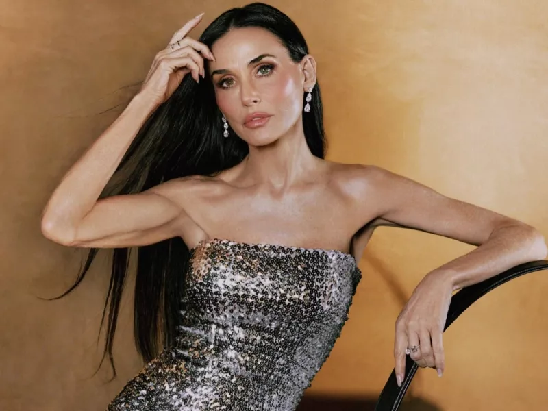 Η Ντέμι Μουρ εμφανίστηκε με ασημένιο στράπλες μίνι φόρεμα κατά την παραλαβή του Fashion Icon Award από το WWD. Η 63χρονη ηθοποιός φωτογραφήθηκε για το περιοδικό με ένα εφαρμοστό φόρεμα διακοσμημένο με πούλιες, το οποίο συνδύασε με μαύρο διαφανές καλσόν και ασημένια σκουλαρίκια.