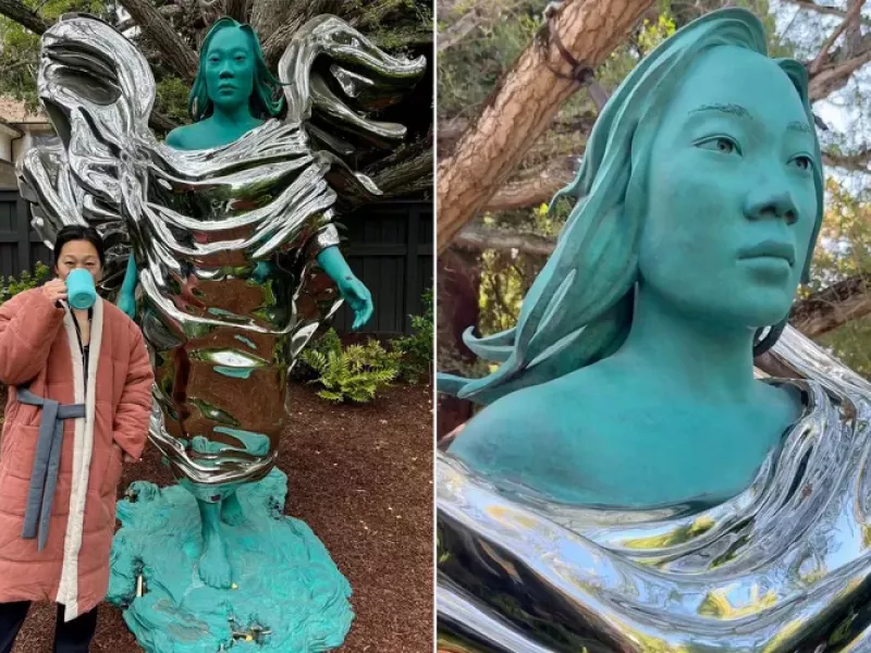 Στη φωτογραφία απεικονίζεται η Priscilla Chan να πίνει το ρόφημα της σε μια ταξιδιωτική κούπα φορώντας μια ροζ ρόμπα με λευκές και μπλε λεπτομέρειες, ενώ στέκεται δίπλα στο άγαλμά της για να δηλώσει την ευγνωμοσύνη της. Το πολύχρωμο έργο τέχνης, είναι δημιούργημα του Daniel Arsham και ενσαρκώνει τη μητέρα τριών παιδιών να προχωρά φορώντας ένα ασημένιο φόρεμα που το φυσά ο αέρας.