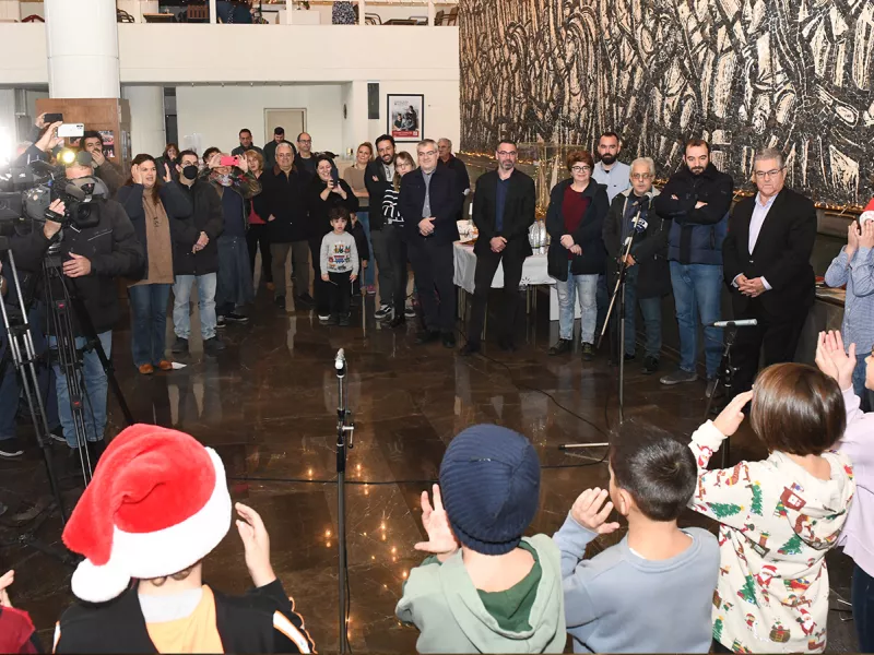 Τα χριστουγεννιάτικα κάλαντα από την παιδική χορωδία «Κόκκινο Αερόστατο» και αντιπροσωπεία του Πανελλήνιου Μουσικού Συλλόγου άκουσαν, σήμερα το πρωί, στον Περισσό ο Γενικός Γραμματέας της Κ.Ε. του ΚΚΕ Δημήτρης Κουτσούμπας και αντιπροσωπεία της Κ.Ε. του κόμματος.