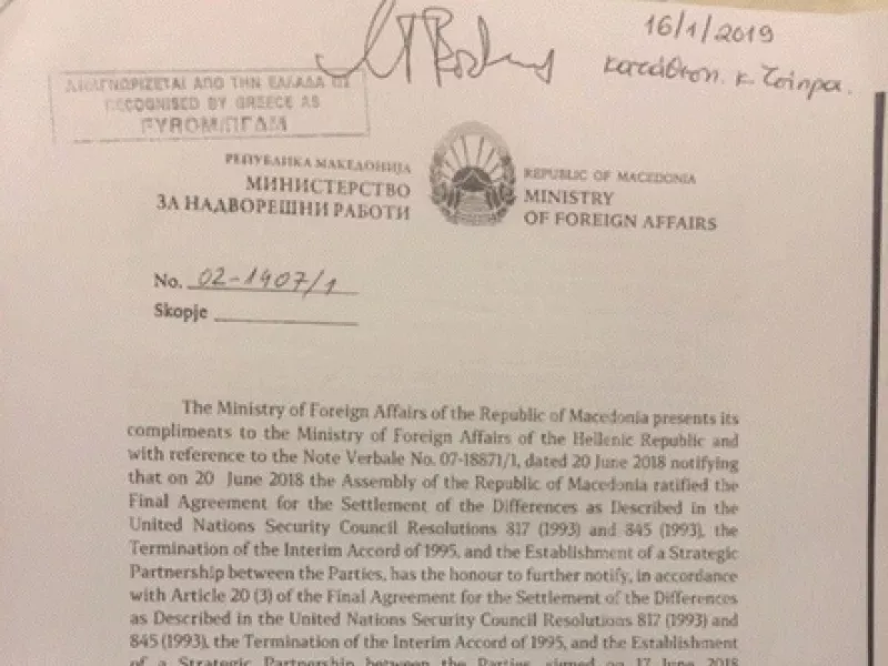 - «Αποτελεί την πιστοποίηση ότι ολοκληρώθηκαν οι εσωτερικές διαδικασίες βάσει του Συντάγματος της ΠΓΔΜ».