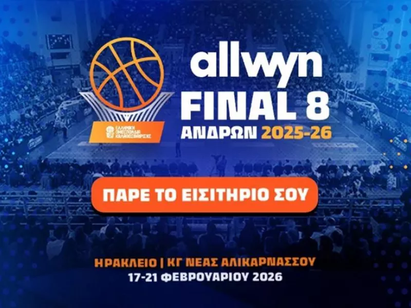 Το Allwyn Final 8 Κυπέλλου Ανδρών επιστρέφει και μπορείτε να ζήσετε από κοντά την εμπειρία και την προσπάθεια των οχτώ ομάδων να φτάσουν στον πρώτο τίτλο του 2026 στο Ηράκλειο Κρήτης από τις 17 ως τις 21 Φεβρουαρίου! Τα εισιτήρια για την τελική φάση ενός θεσμού που μπαίνει στη δεύτερη πεντηκονταετία της ζωής του και σε μια νέα εποχή, διατίθενται από σήμερα ηλεκτρονικά και μπορείτε να τα αποκτήσετε με ένα «κλικ» ΕΔΩ!