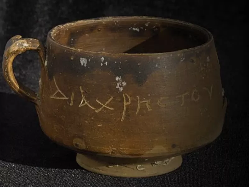 Εκπληκτικά καλά διατηρημένο, το πήλινο κύπελλο στερείται μόνο μιας λαβής και φέρει την ελληνική επιγραφή «ΔΙΑ ΧΡΗΣΤΟΥ Ο ΓΟΙΣΤΑΙΣ», που μεταφράζεται ως «Δια του Χριστού του ψάλτη».