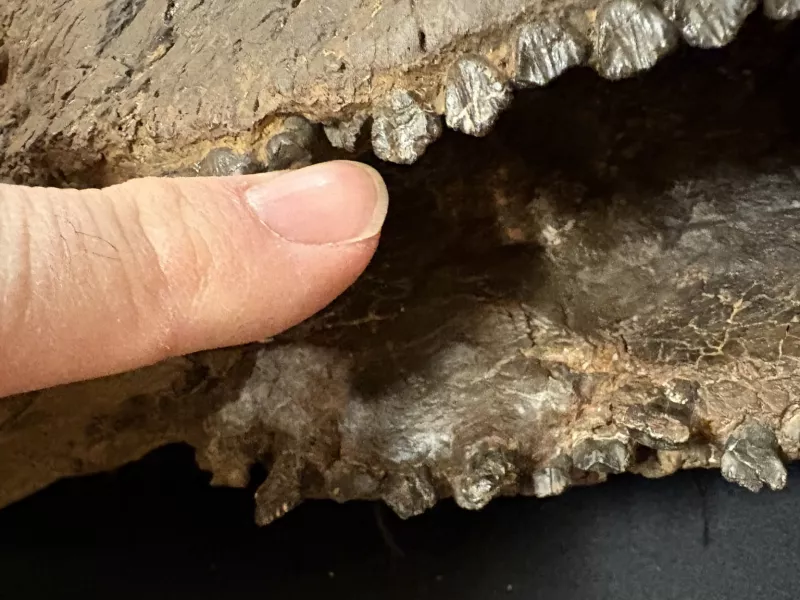 Ψαχουλεύοντας, ο Καράνο διέσχισε τις δύο σειρές από τα πάνω δόντια του Παχυκεφαλόσαυρου - δεκάδες συνολικά - συμπεριλαμβανομένου ενός αιχμηρού, μικρότερου που μόλις έβγαινε όταν τελείωσε η ζωή του πλάσματος. Από τα στοιχεία της φθοράς, οι επιστήμονες ελπίζουν να μάθουν για το πώς το μασούσαν και πόσο σκληρά ήταν τα υλικά στη διατροφή του.