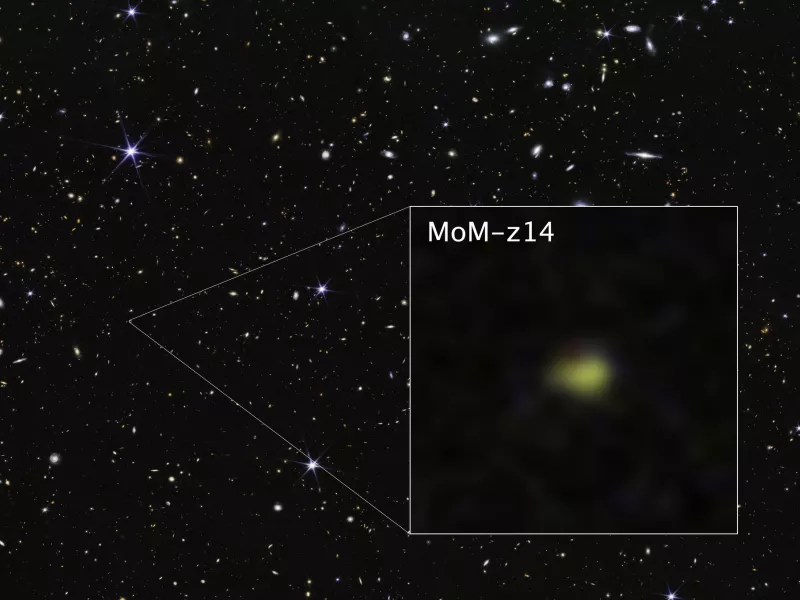 Χρησιμοποιώντας το όργανο NIRSpec (Φασματογράφος Εγγύς Υπέρυθρου) του James Webb, οι αστρονόμοι επιβεβαίωσαν ότι το φως του γαλαξία MoM-z14 ταξιδεύει μέσα στον διαστελλόμενο χώρο, επιμηκυνόμενο και «μετατοπιζόμενο» προς μεγαλύτερα, πιο ερυθρά μήκη κύματος, για περίπου 13,5 από τα εκτιμώμενα 13,8 δισεκατομμύρια χρόνια ύπαρξης του Σύμπαντος.