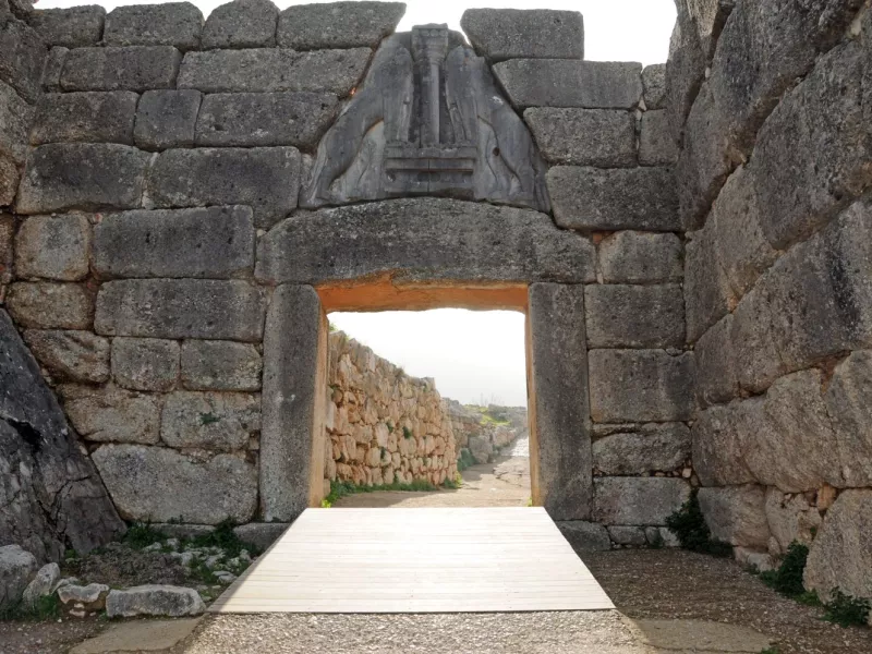 Η είσοδος της Ακρόπολης βρίσκεται στα βορειοδυτικά. Και ο λόγος φυσικά για την πολυφωτογραφημένη και σημαίνουσας αξίας Πύλη των Λεόντων, που το τριγωνικό κενό του ανωφλιού της φέρει το αρχαιότερο δείγμα μνημειακής γλυπτικής στην Ευρώπη! Δύο λιοντάρια, που τα κεφάλια τους λείπουν, κατασκευασμένα πιθανώς από στεατίτη, στέκονται αντιμέτωπα στηρίζοντας τα μπροστινά τους πόδια πάνω σε δύο βωμούς και μεταξύ αυτών υψώνεται ένας κίονας με ιδιότυπο κιονόκρανο και άβακα στην κορυφή. Πάνω από τον άβακα σχηματίζονται τέσσερις δίσκοι, που ερμηνεύονται ως δοκοί στέγης. Την πύλη έκλεινε δίφυλλη ξύλινη πόρτα με χάλκινη επένδυση. Πιο δεξιά βρίσκεται η σιταποθήκη, που ήταν σε χρήση μέχρι την καταστροφή της ακρόπολης. Ανάμεσα στη σιταποθήκη και στον εσωτερικό τοίχο της Πύλης των Λεόντων υπήρχε κλιμακοστάσιο που οδηγούσε στην κορυφή του τείχους.