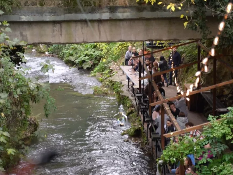 Καφές, φαγητό, γλυκό – όλα σε εναέριο δίσκο, ο οποίος ταξιδεύει πάνω από το ποτάμι του Τριπόταμου και φτάνει κατευθείαν στο τραπεζάκι μας…