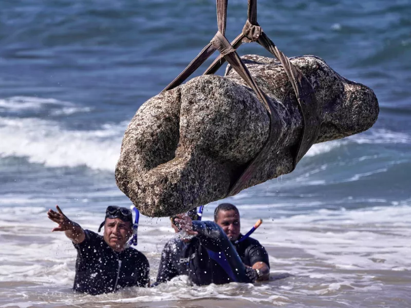 Την Πέμπτη, γερανοί ανέσυραν αργά τα αγάλματα από τα βάθη, ενώ δύτες με στολές, που είχαν βοηθήσει στην ανάσυρσή τους, επευφημούσαν από την ακτή.