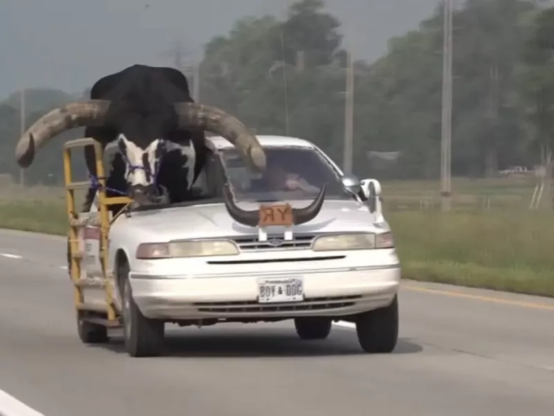 Φυσικά, η πόρτα του συνοδηγού είχε αντικατασταθεί με ένα μεταλλικό προστατευτικό κιγκλίδωμα για να χωράει και η αγελάδα ενώ η πινακίδα σε αυτό έγραφε «Η μεγάλη παρέλαση ροντέο της Νεμπράσκα: Καλύτερη είσοδος αυτοκινήτου».