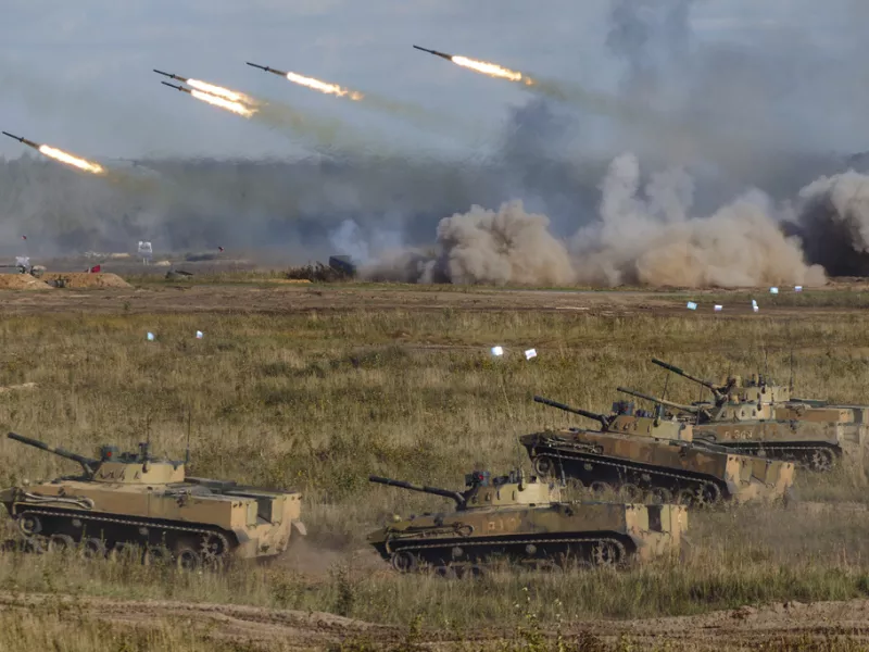 Σ’ ένα μεγάλο πεδίο περίπου 72 χιλιόμετρα έξω από το Μινσκ, η εικόνα θυμίζει πραγματική μάχη. Βομβαρδιστικά Sukhoi-34 ρίχνουν κατευθυνόμενες βόμβες, οι εκρήξεις συγκλονίζουν την περιοχή και σύννεφα καπνού υψώνονται στον ουρανό. Ελικόπτερα μάχης ενισχύουν την επίθεση, ενώ drones παρακολούθησης καταγράφουν την καταστροφή.