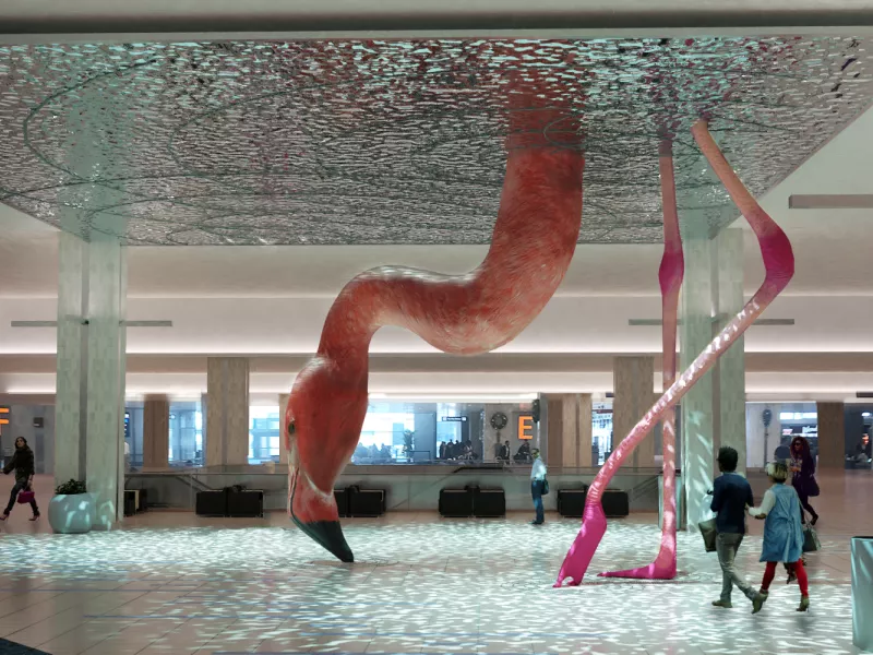 Με επωνυμία «HOME», το ζωηρόχρωμο ύψους 6,7 μέτρων γλυπτό του Matthew Mazzotta συνοδεύεται από ταβάνι που μιμείται το ρυτίδισμα του νερού. Ο φωτισμός, που αλλάζει με το φως της ημέρας απ' έξω, ρίχνει την ίδια διάστικτη λάμψη στο δάπεδο και δημιουργεί την ψευδαίσθηση ότι το φλαμίνγκο έχει βυθίσει την κεφαλή του κάτω από το νερό.